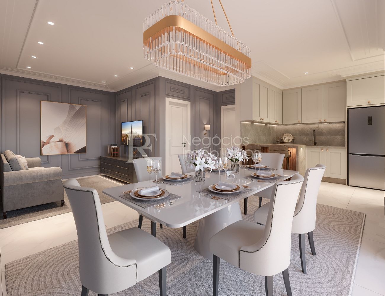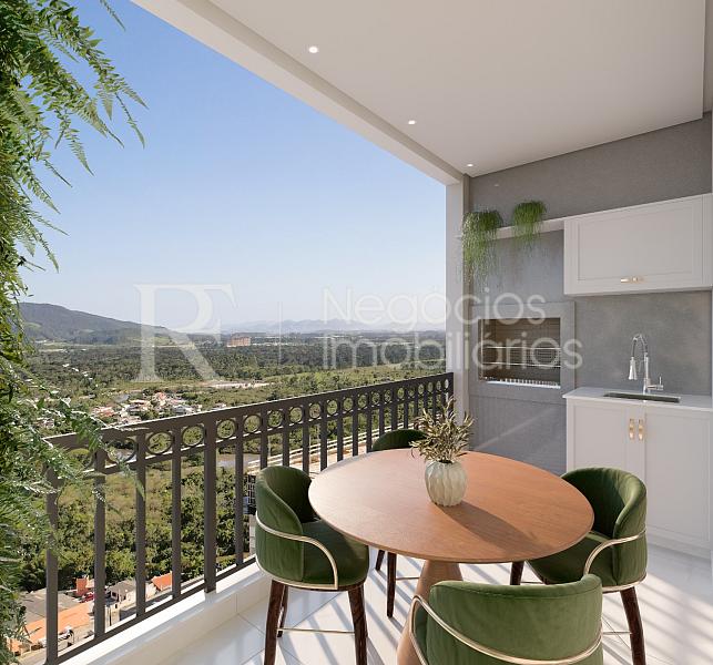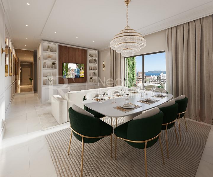 Living integrado à sala de jantar e cozinha, com iluminação natural e ventilação privilegiada